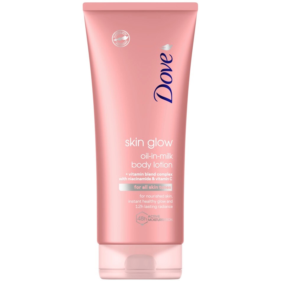 Vem har sagt att din bodylotion bara ska göra en sak? När du önskar den silkeslena känsla och rikliga återfuktning en kroppslotion ger plus en härligt fräsch hud som strålar av lysterär Dove Skin Glow Oil-In-Milk Body Lotion den dubbelverkade hudvårdslösning din hud behöver. Denna unika lystergivande kroppslotion för alla hudtyper är en ny kroppsvårdsprodukt från Dove som kombinerar Doves välkända närande och vårdande effekt med härlig lyster som får huden att upplevas som skimrande inifrån.Denna oil-in-milk-kroppslotion börjar verkar omedelbart efter applicering genom att tillföra näring och förbättra hudens lyster. Den ljuvliga persikodoftande lotionen är särskilt utveckladmed ett vitaminkomplex som innehåller niacinamid och C-vitamin , naturlig olja och lakritsrotextrakt. De ljusreflekterande mineralerna ger huden omedelbar lyster och hjälper till att boosta lystern inifrån. Huden blir mjukare, slätare och får strålande lyster som varar hela dagen. Dove Skin Glow Oil-In-Milk Body Lotion med ljusreflekterande mineraler* och vitaminkomplex hjälper till att boosta matt och glåmig hud. Applicera varje morgon på ren och torr hud och se hur din hud får nytt liv. Du kan till och ge din redan solbruna hud lite diskret lyster – det är ett fantastiskt sätt att förstärka glowet ännu mer. Använd denna lystergivande kroppslotion för att ge din solbrända hud mer lyster eller tillföra lite nytt glow när din solbränna har börjat mattas av. Dove Skin Glow är en härlig kroppslotion för din sommarhud men passar med sitt vitaminkomplex som vårdar och ger lyster även perfekt för torr och vintertrött hud. Applicera denna lyxiga, dermatologiskt testade lotion på din kropp och upplev hur din hud får härlig, strålande lyster. För att ge din hud rikligt med lyster, fokusera på områden med bar hud såsom armar, ben, fötter och till och med nacke, axlar och nyckelben. Spara den inte till speciella tillfällen – din hud förtjänar härlig lyster varje dag. Dove testar inte på djur någonstans i världen**.*Mican som används kommer uteslutande från en gruva i Hartwell (Georgia, USA) och framställs under etiska arbetsförhållanden med miljövänliga inköp och en spårbar leveranskedja.**Globalt sett testar Dove inte på djur, inte ens i de länder där djurförsök är ett krav Cruelty-free-certifierad av PETA. Mer information finns på dove.com/no animal testing.200 ml