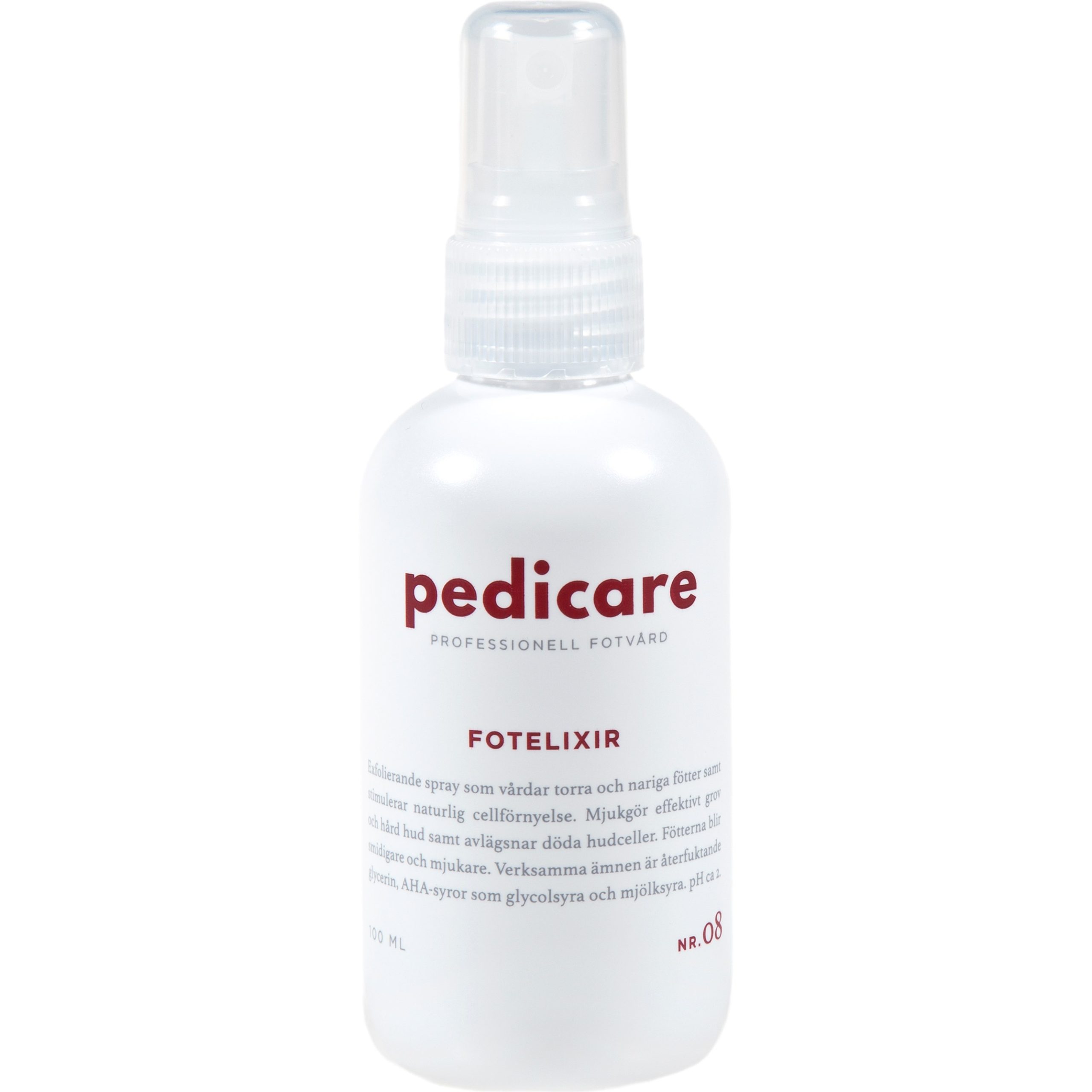 Pedicare Fot Elixir är en skönt exfolierande spray som vårdar torra och nariga fötter samt stimulerar naturlig cellförnyelse.Pedicare Fot Elixir är en olja som snabbt och effektivt mjukgör grov och hård hud, självsprickor samt avlägsnar döda hudceller. Fötterna blir smidigare och mjukare genom att oljan lätt tränger in i huden och förebygger uppkomsten av förhårdnader och självsprickor.100ml