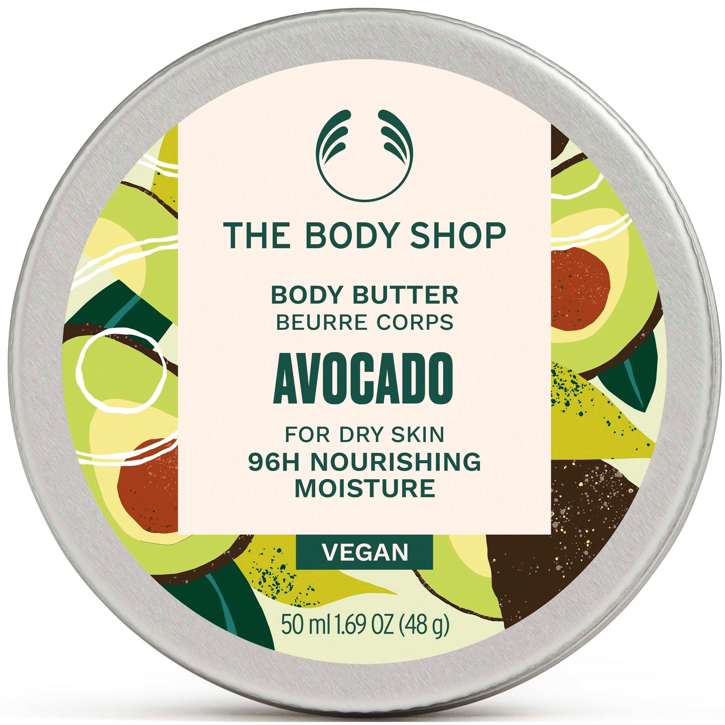 Älska och vårda torr hud som aldrig förr med Avocado Body Butter.Avocado Body Butter återfuktar huden i 96 timmar och 96 % av ingredienserna är av naturligt ursprung – som hållbart producerad avokadoolja från Sydafrika, handgjort Community Fair Trade-sheasmör från Ghana och Community Fair Trade-paranötsolja från Brasilien. Perfekt för att vårda torr hud så att den känns mjukare och smidigare och får en naturligt fin glow.Detta superkrämiga Body Butter finns nu i en återvinningsbar förpackning med aluminiumlock och 100 % återvunnen plast, som vår Community Fair Trade-plast från Indien. Så nu kan du visa både kroppen och planeten mer omtanke. Smörj in så mycket du vill. Inget klibb eller kladd. Bara den där sköna känslan av att verkligen ta hand om din hud och dig själv.Moisturizer för kroppen.Perfekt för torr hud.Vårdar och skyddar huden med återfuktning i 96 timmar.Grön, krämig doft.96 % av ingredienserna är av naturligt ursprung.Certifierad av The Vegan SocietyDermatologiskt testad.Användning:Torka huden försiktigt med en handduk efter duschen.Ta en klick Body Butter i handen.Smörj in med mjuka, långsamma rörelser.Ge torra områden som på knän, armbågar och fötter lite extra omtanke.Låt sjunka in i fem minuter innan du klär på dig.Njut av den mjuka och smidiga känslan på huden.Överös din hud med omtanke en gång om dagen.50 ml